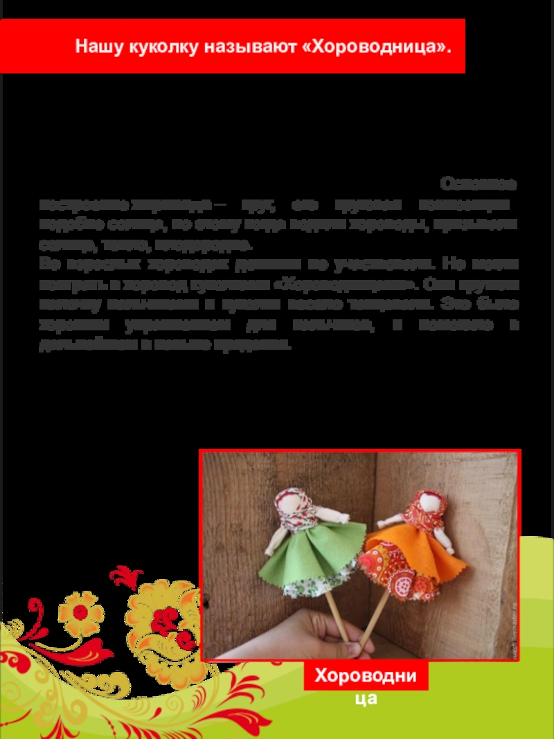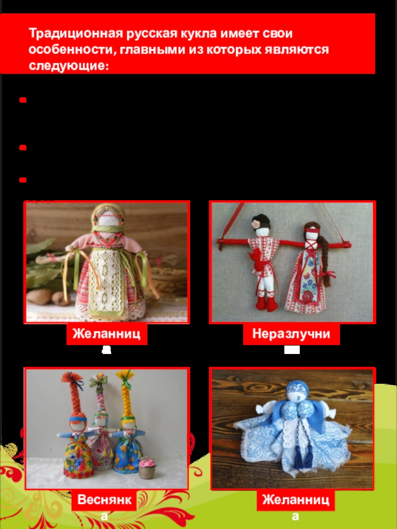 Традиционная русская кукла имеет свои особенности, главными из которых являются следующие: