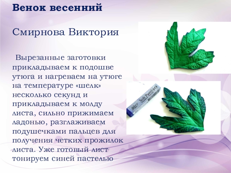 Вырезанные заготовки прикладываем к подошве утюга и нагреваем на утюге на температуре «шелк» несколько секунд и прикладываем к молду листа, сильно прижимаем ладонью, разглаживаем подушечками пальцев для получения четких прожилок листа. Уже готовый лист тонируем синей пастелью