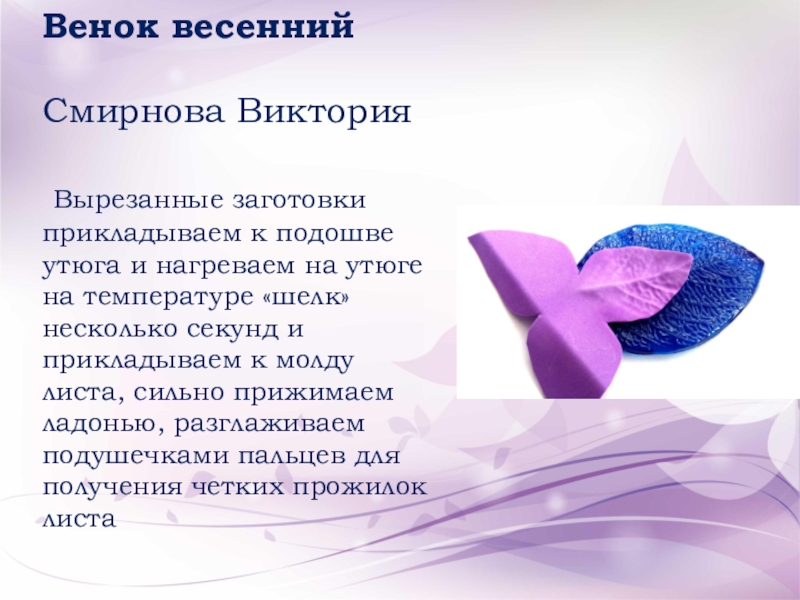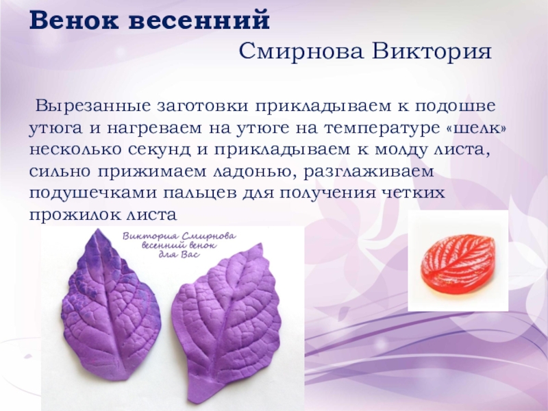 Вырезанные заготовки нагреваем на утюге на температуре «шелк» несколько секунд и прикладываем к молду листа, сильно прижимаем ладонью, разглаживаем подушечками пальцев для получения четких прожилок листа