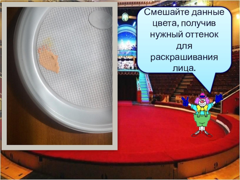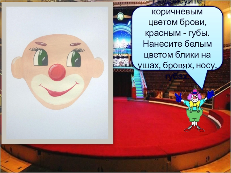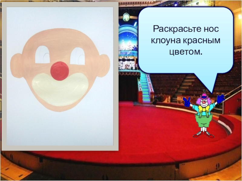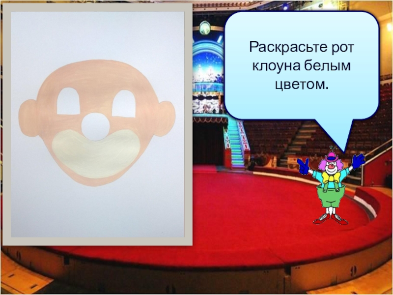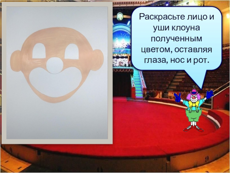 Раскрасьте лицо и уши клоуна полученным цветом, оставляя глаза, нос и