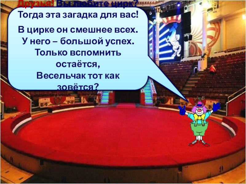 Друзья! Вы любите цирк? Тогда эта загадка для вас!В цирке он смешнее всех.У него – большой успех.Только вспомнить остаётся,Весельчак тот как зовётся?