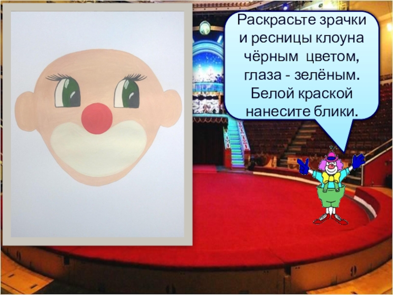 Раскрасьте зрачки и ресницы клоуна чёрным цветом, глаза - зелёным. Белой краской нанесите блики.