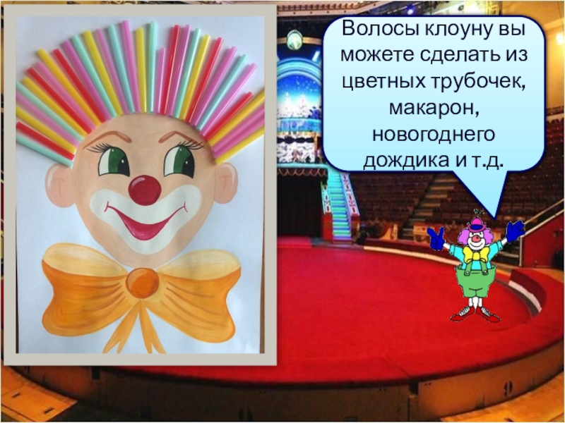 Волосы клоуну вы можете сделать из цветных трубочек, макарон, новогоднего дождика