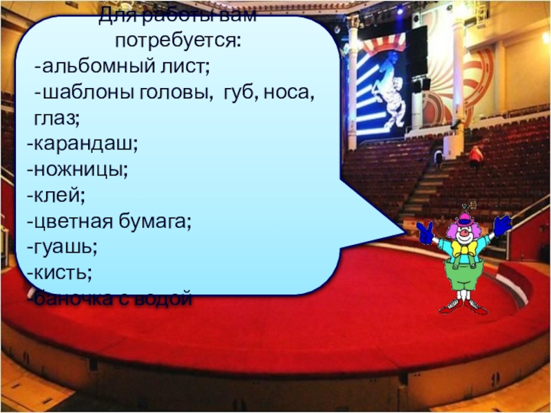 Для работы вам потребуется:-альбомный лист;-шаблоны головы, губ, носа, глаз; карандаш;ножницы;клей;цветная бумага; гуашь;кисть;баночка с водой