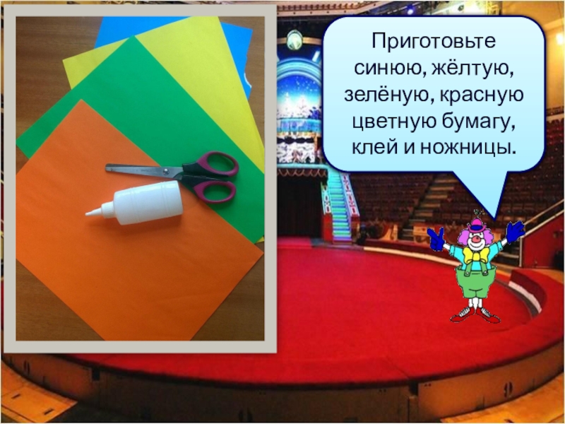 Приготовьте синюю, жёлтую, зелёную, красную цветную бумагу, клей и ножницы.