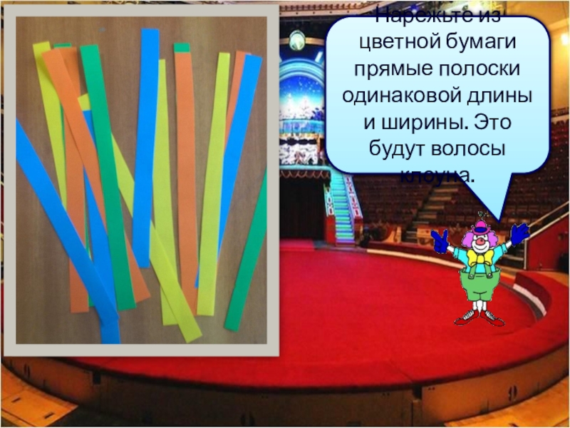 Нарежьте из цветной бумаги прямые полоски одинаковой длины и ширины. Это будут волосы клоуна.