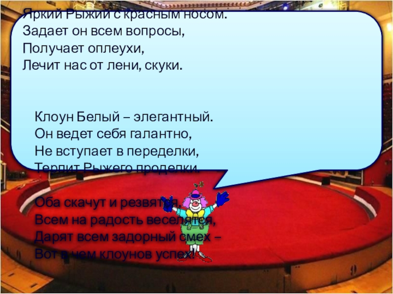 Клоун в цирке каждый вечер. Сколько радости от встречи – Балагурит и хохочет, Рассмешит,