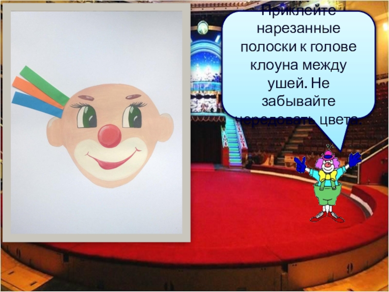 Приклейте нарезанные полоски к голове клоуна между ушей. Не забывайте чередовать