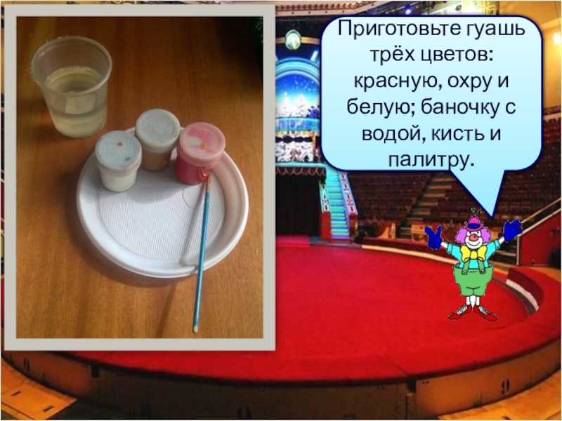 Приготовьте гуашь трёх цветов: красную, охру и белую; баночку с водой, кисть и палитру.