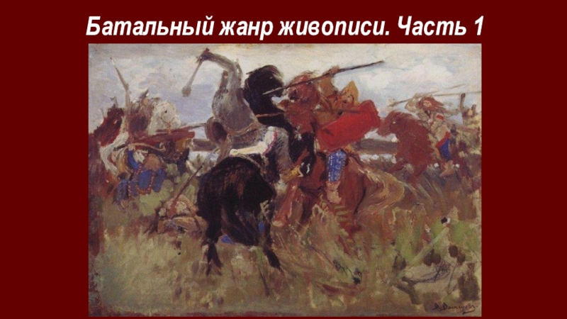 Главное место в батальном жанре занимают сцены сухопутных и морских сражений, военных походов прошлого и современности.