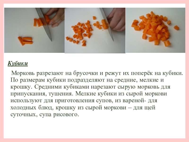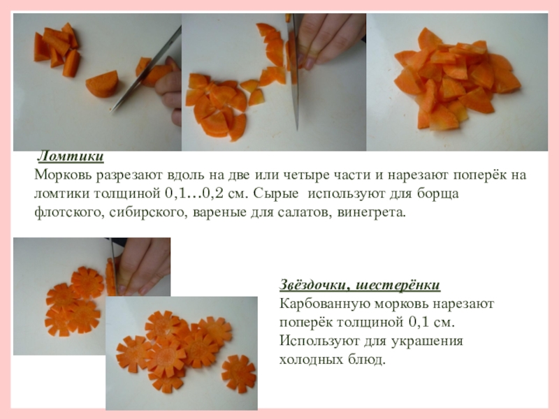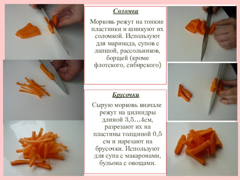Сырую морковь вначале режут на цилиндры длиной 3,5…4см, разрезают их на пластины толщиной 0,5см и нарезают на брусочки. Используют для супа с макаронами, бульона с овощами.