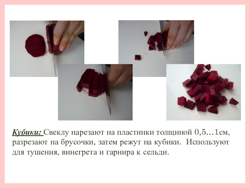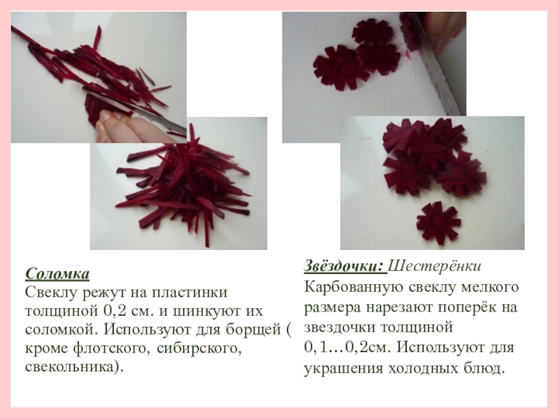 Звёздочки: Шестерёнки Карбованную свеклу мелкого размера нарезают поперёк на звездочки толщиной 0,1…0,2см. Используют для украшения холодных блюд.