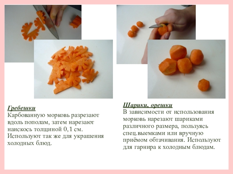 В зависимости от использования морковь нарезают шариками различного размера, пользуясь спец.выемками или вручную приёмом обтачивания. Используют для гарнира к холодным блюдам.
