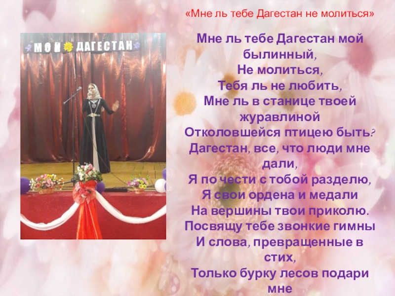 Темаева А.И. читает стихотворение Р.Гамзатова«Мне ль тебе Дагестан не молиться»Мне ль тебе Дагестан мой былинный,Не молиться,Тебя ль