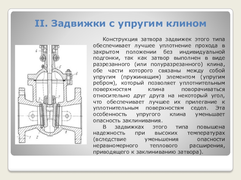 уплотнение прохода в закрытом положении без индивидуальной подгонки, так как затвор выполнен в виде разрезанного (или полуразрезанного) клина, обе части которого связаны между собой упругим (пружинящим) элементом (упругим ребром), который позволяет уплотнительным поверхностям клина поворачиваться относительно друг друга на некоторый угол, что обеспечивает лучшее их прилегание к уплотнительным поверхностям седел. Эта особенность упругого клина уменьшает опасность заклинивания.