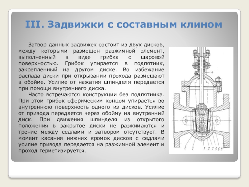 Часто встречаются конструкции без подпятника. При этом грибок сферическим концом упирается во внутреннюю поверхность одного из дисков. Усилие от привода передается через обойму на внутренний диск. При движения шпинделя из открытого положения в закрытое диски не разжимаются и трение между седлами и затвором отсутствует. В момент касания нижних кромок дисков с седлами усилие привода передается на разжимной элемент и проход герметизируется.