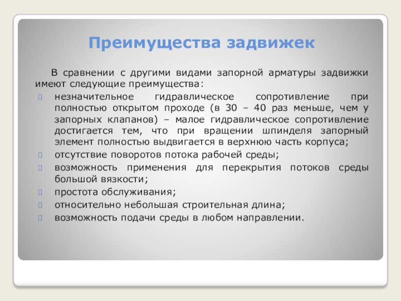 В сравнении с другими видами запорной арматуры задвижки имеют следующие