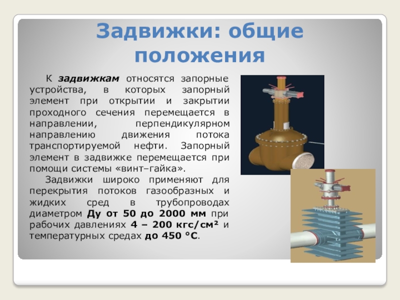 Задвижки широко применяют для перекрытия потоков газообразных и жидких сред в трубопроводах диаметром Ду от 50 до 2000 мм при рабочих давлениях 4 – 200 кгс/см² и температурных средах до 450 °С.
