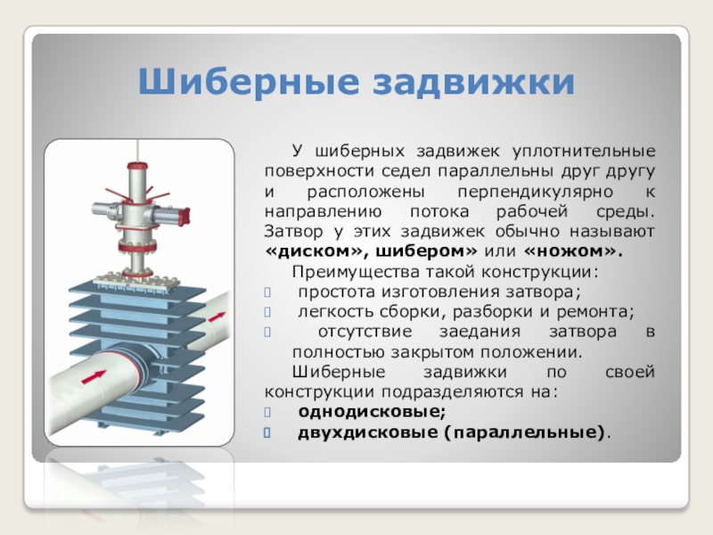 расположены перпендикулярно к направлению потока рабочей среды. Затвор у этих задвижек обычно называют «диском», шибером» или «ножом».