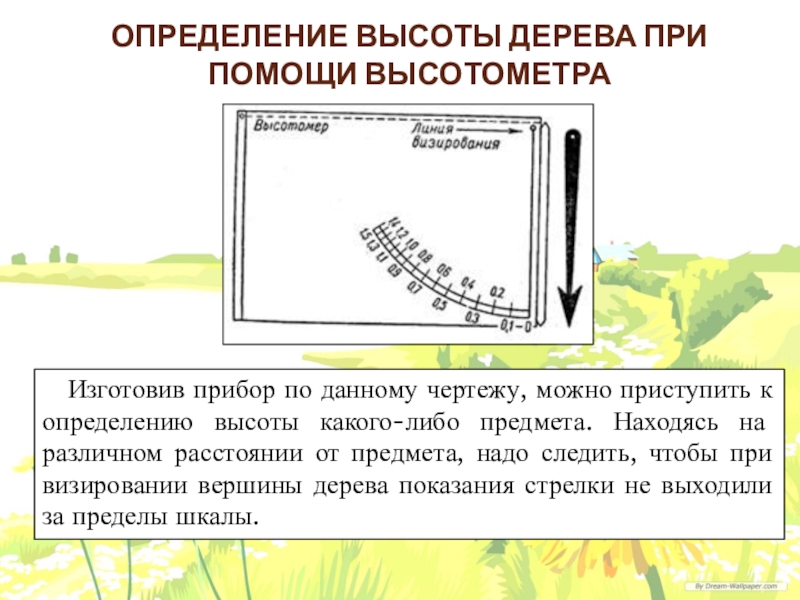можно приступить к определению высоты какого-либо предмета. Находясь на различном расстоянии от предмета, надо следить, чтобы при визировании вершины дерева показания стрелки не выходили за пределы шкалы.