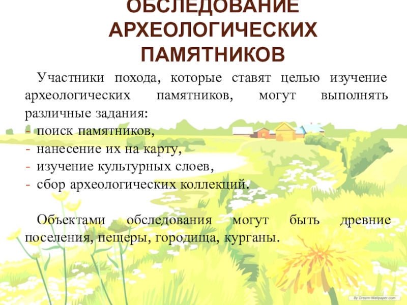 Объектами обследования могут быть древние поселения, пещеры, городища, курганы.
