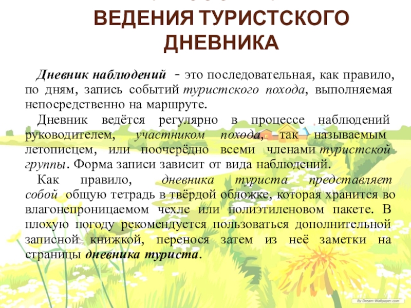 Дневник ведётся регулярно в процессе наблюдений руководителем, участником похода, так называемым летописцем, или поочерёдно всеми членами туристской группы. Форма записи зависит от вида наблюдений.