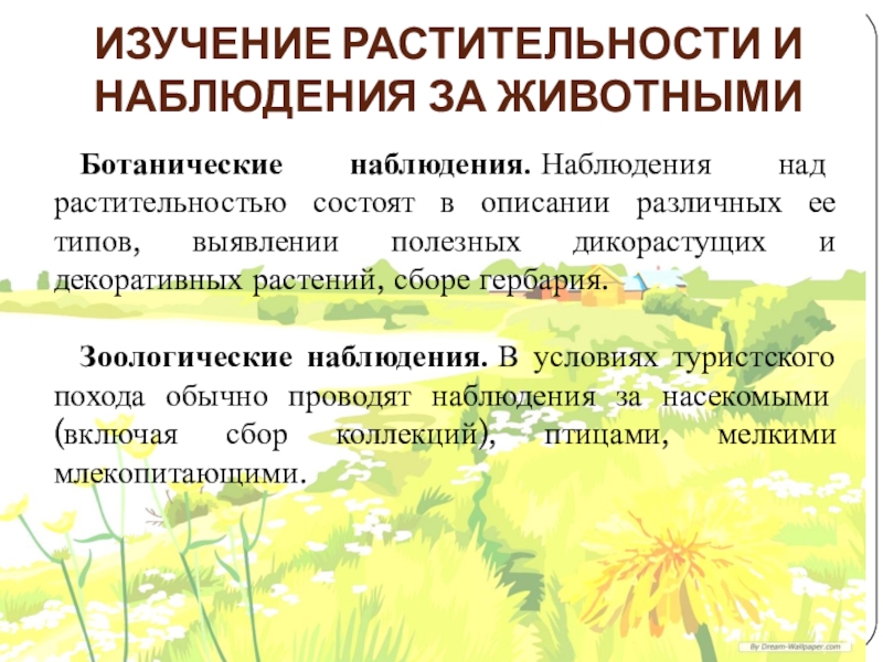 Зоологические наблюдения. В условиях туристского похода обычно проводят наблюдения за насекомыми (включая сбор коллекций), птицами, мелкими млекопитающими.