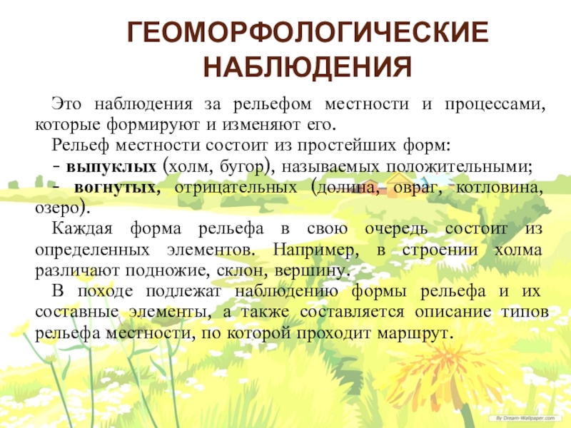 Это наблюдения за рельефом местности и процессами, которые формируют