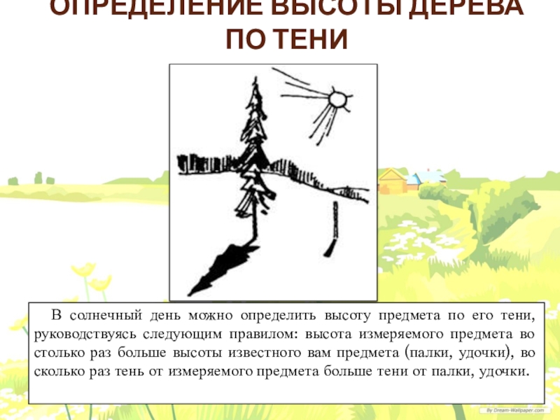 по его тени, руководствуясь следующим правилом: высота измеряемого предмета во столько раз больше высоты известного вам предмета (палки, удочки), во сколько раз тень от измеряемого предмета больше тени от палки, удочки.