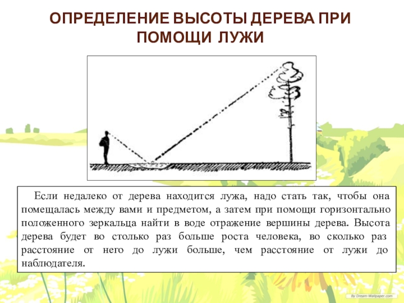 надо стать так, чтобы она помещалась между вами и предметом, а затем при помощи горизонтально положенного зеркальца найти в воде отражение вершины дерева. Высота дерева будет во столько раз больше роста человека, во сколько раз расстояние от него до лужи больше, чем расстояние от лужи до наблюдателя.