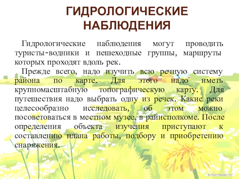 Гидрологические наблюдения могут проводить туристы-водники и пешеходные группы, маршруты которых