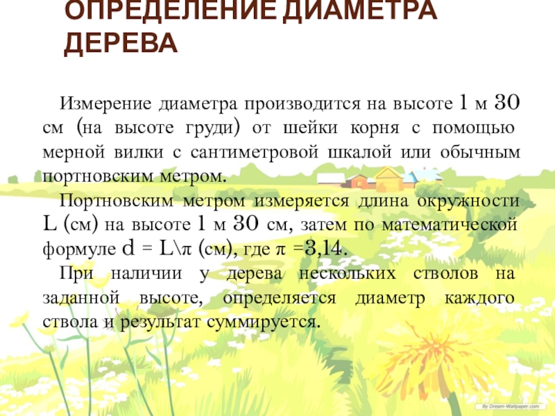 Портновским метром измеряется длина окружности L (см) на высоте 1 м 30 см, затем по математической формуле d = L\π (см), где π =3,14.