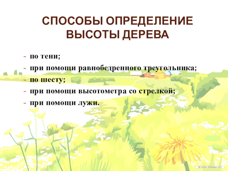 Слайд 13Определение высоты дерева при помощи равнобедренного треугольника