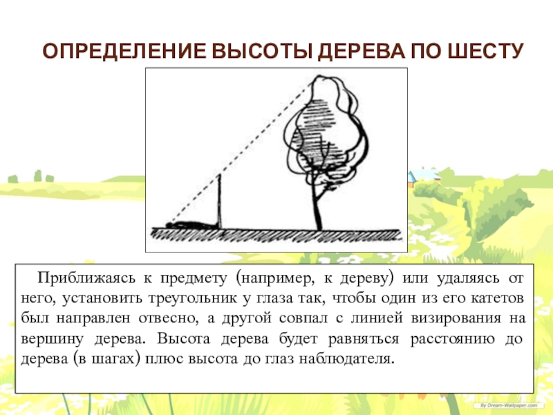 дереву) или удаляясь от него, установить треугольник у глаза так, чтобы один из его катетов был направлен отвесно, а другой совпал с линией визирования на вершину дерева. Высота дерева будет равняться расстоянию до дерева (в шагах) плюс высота до глаз наблюдателя.