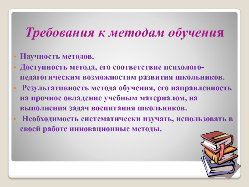 Результативность метода обучения, его направленность на прочное овладение учебным материалом, на выполнения задач воспитания школьников.