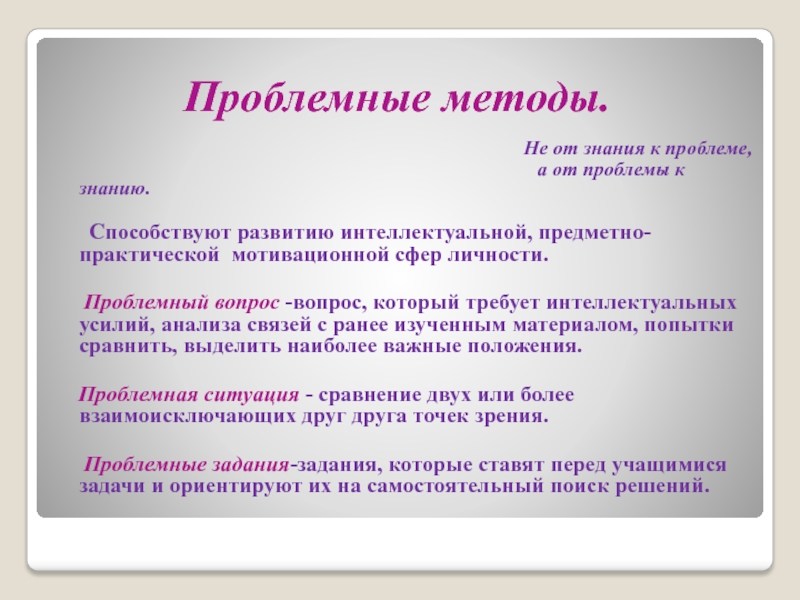 Проблемный вопрос -вопрос, который требует интеллектуальных усилий, анализа связей с ранее изученным материалом, попытки сравнить, выделить наиболее важные положения.
