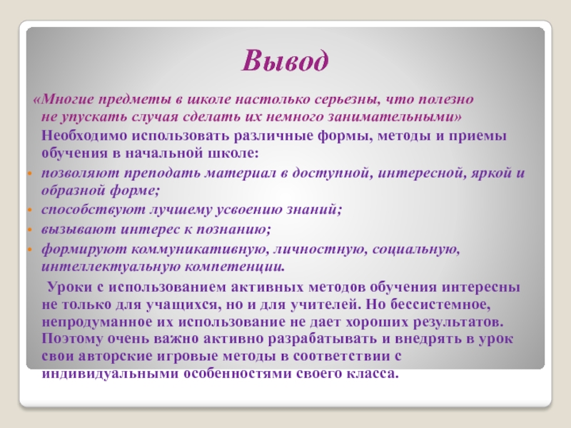 Уроки с использованием активных методов обучения интересны не только для учащихся, но и для учителей. Но бессистемное, непродуманное их использование не дает хороших результатов. Поэтому очень важно активно разрабатывать и внедрять в урок свои авторские игровые методы в соответствии с индивидуальными особенностями своего класса.