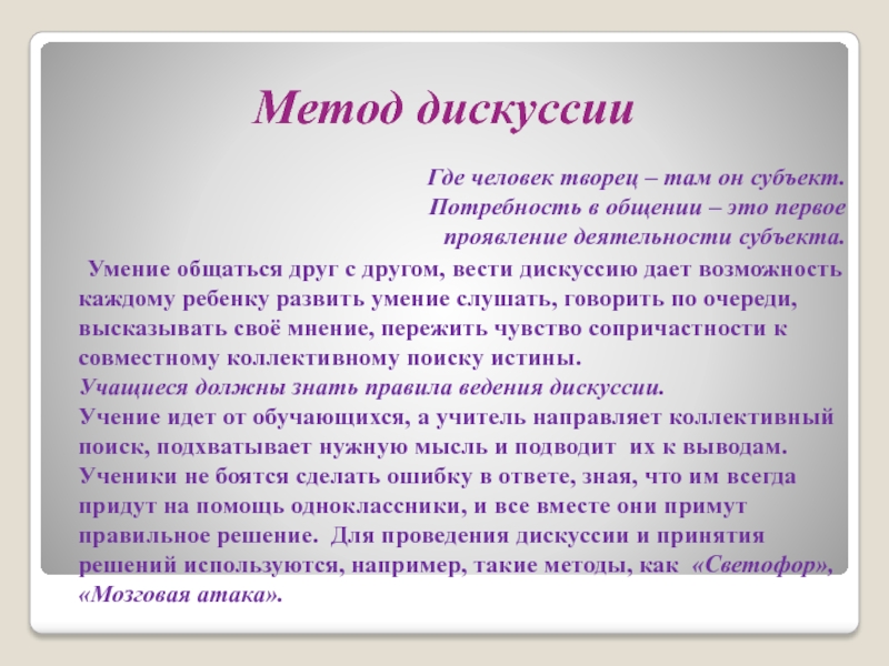 Умение общаться друг с другом, вести дискуссию дает возможность каждому ребенку развить умение слушать, говорить по очереди, высказывать своё мнение, пережить чувство сопричастности к совместному коллективному поиску истины. Учащиеся должны знать правила ведения дискуссии. Учение идет от обучающихся, а учитель направляет коллективный поиск, подхватывает нужную мысль и подводит их к выводам. Ученики не боятся сделать ошибку в ответе, зная, что им всегда придут на помощь одноклассники, и все вместе они примут правильное решение. Для проведения дискуссии и принятия решений используются, например, такие методы, как «Светофор», «Мозговая атака».