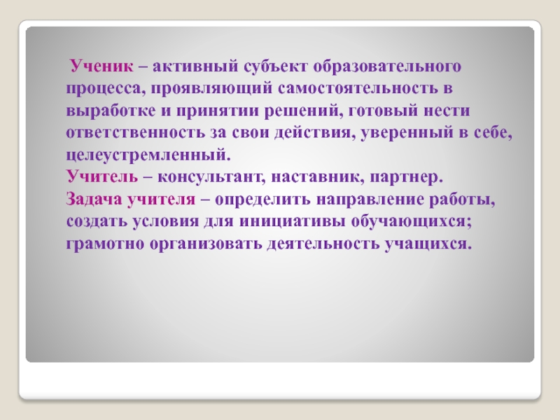 в выработке и принятии решений, готовый нести ответственность за свои действия, уверенный в себе, целеустремленный. Учитель – консультант, наставник, партнер. Задача учителя – определить направление работы, создать условия для инициативы обучающихся; грамотно организовать деятельность учащихся.