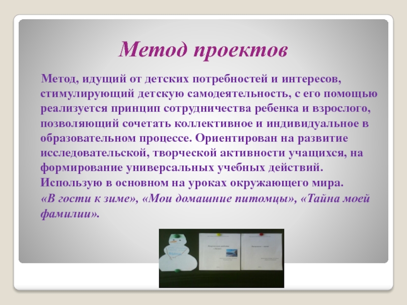 детскую самодеятельность, с его помощью реализуется принцип сотрудничества ребенка и взрослого, позволяющий сочетать коллективное и индивидуальное в образовательном процессе. Ориентирован на развитие исследовательской, творческой активности учащихся, на формирование универсальных учебных действий. Использую в основном на уроках окружающего мира.