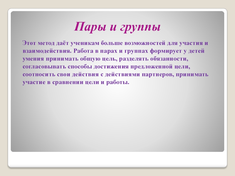 участия и взаимодействия. Работа в парах и группах формирует у детей умения принимать общую цель, разделять обязанности, согласовывать способы достижения предложенной цели, соотносить свои действия с действиями партнеров, принимать участие в сравнении цели и работы.