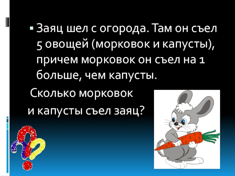 Слайд 6Заяц шел с огорода. Там он съел 5 овощей (морковок и