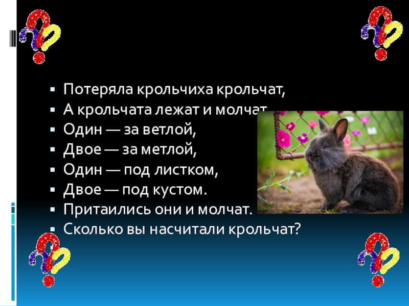 Слайд 3Потеряла крольчиха крольчат,
