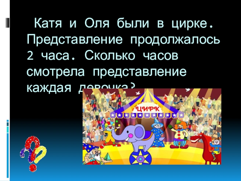 Слайд 19 Катя и Оля были в цирке. Представление продолжалось 2 часа. Сколько