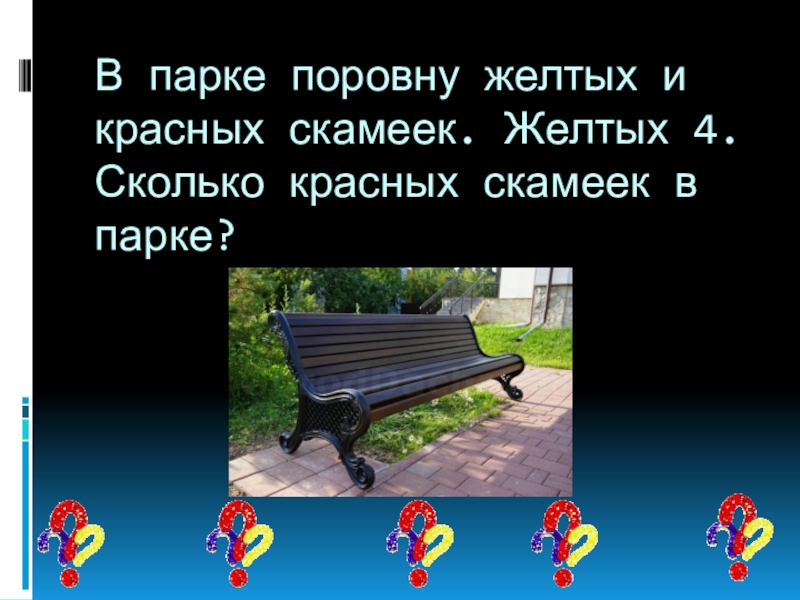 Слайд 18В парке поровну желтых и красных скамеек. Желтых 4. Сколько красных