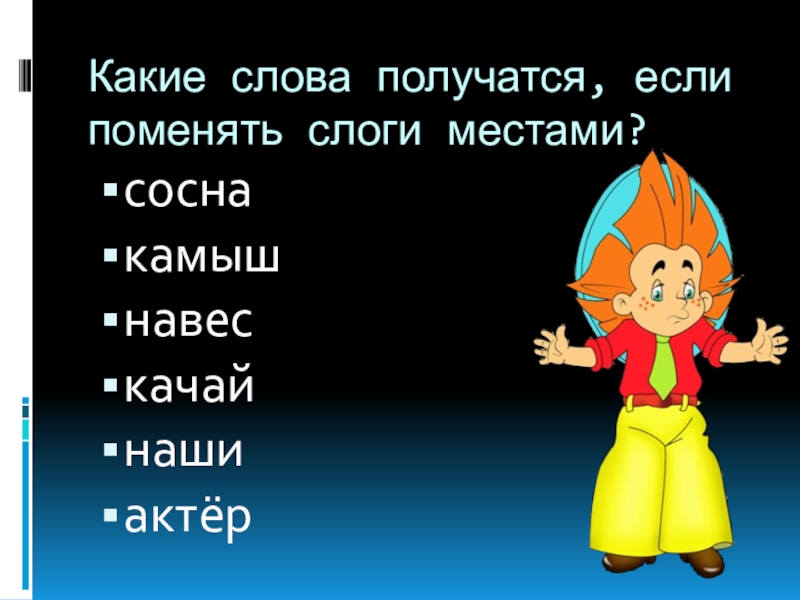 Слайд 15Какие слова получатся, если поменять слоги местами?
