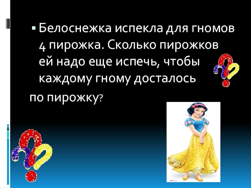 Слайд 5Белоснежка испекла для гномов 4 пирожка. Сколько пирожков ей надо еще