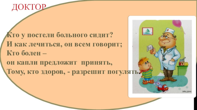 ДОКТОР   Кто у постели больного сидит?И как лечиться, он всем говорит;Кто болен – он