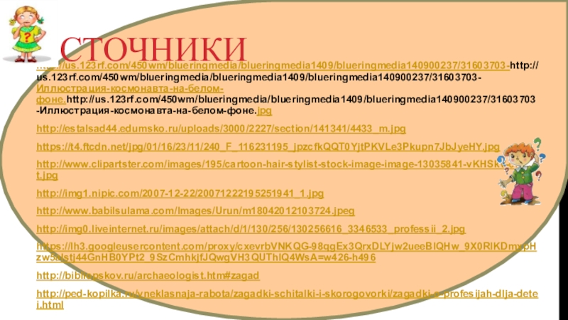 ИСТОЧНИКИhttp://us.123rf.com/450wm/blueringmedia/blueringmedia1409/blueringmedia140900237/31603703-http://us.123rf.com/450wm/blueringmedia/blueringmedia1409/blueringmedia140900237/31603703-Иллюстрация-космонавта-на-белом-фоне.http://us.123rf.com/450wm/blueringmedia/blueringmedia1409/blueringmedia140900237/31603703-Иллюстрация-космонавта-на-белом-фоне.jpghttp://estalsad44.edumsko.ru/uploads/3000/2227/section/141341/4433_m.jpghttps://t4.ftcdn.net/jpg/01/16/23/11/240_F_116231195_jpzcfkQQT0YjtPKVLe3Pkupn7JbJyeHY.jpghttp://www.clipartster.com/images/195/cartoon-hair-stylist-stock-image-image-13035841-vKHSkV-clipart.jpghttp://img1.nipic.com/2007-12-22/20071222195251941_1.jpghttp://www.babilsulama.com/Images/Urun/m18042012103724.jpeg http://img0.liveinternet.ru/images/attach/d/1/130/256/130256616_3346533_professii_2.jpg https://lh3.googleusercontent.com/proxy/cxevrbVNKQG-98qgEx3QrxDLYjw2ueeBlQHw_9X0RIKDmxpHzw5aIstj44GnHB0YPt2_9SzCmhkjfJQwgVH3QUThIQ4WsA=w426-h496 http://bibliopskov.ru/archaeologist.htm#zagadhttp://ped-kopilka.ru/vneklasnaja-rabota/zagadki-schitalki-i-skorogovorki/zagadki-o-profesijah-dlja-detei.html