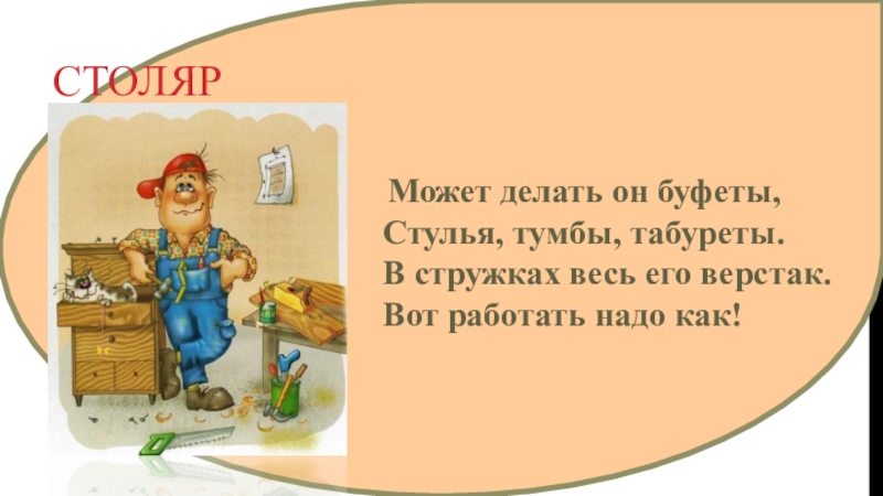 СТОЛЯР    Может делать он буфеты,   Стулья, тумбы, табуреты.   В стружках весь его верстак.